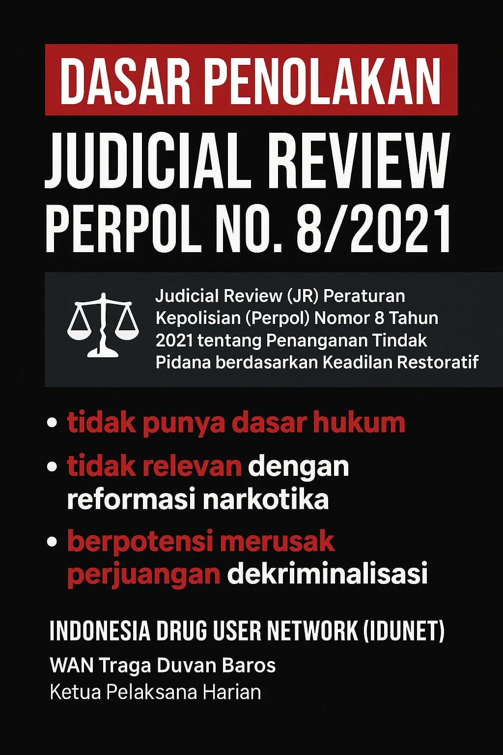 The Judicial Review (JR) of Police Regulation (Perpol) Number 8 of 2021 on the Handling of Criminal Acts Based on Restorative Justice is currently being proposed by several parties. IDUNET firmly rejects this move, as it lacks a clear legal basis, is irrelevant to the agenda of narcotics policy reform, and has the potential to undermine the struggle for the decriminalization of narcotics users in Indonesia.